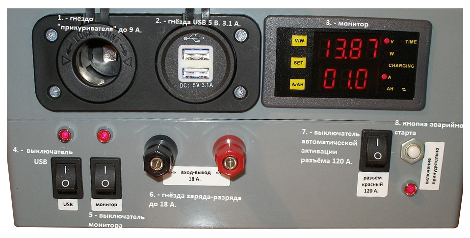 Активация данного разъёма для потребителей (инверторов, электролебёдок и прочего.) осуществляется путём включения выключателя № 7 и последующего нажатия кнопки аварийного старта № 8, светодиодный индикатор № 9 укажет на наличие напряжения на данном разъёме.
