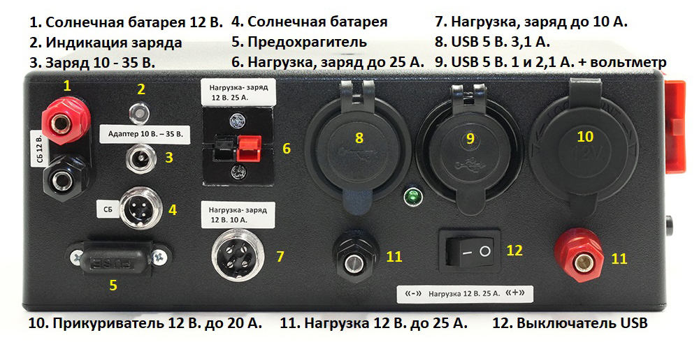 6 - Разъём Anderson 12 В. 25 А. предназначен для подключения нагрузки непрерывным током до 25 А. и кратковременным током до 50 А. (для мощных потребителей, радиостанций, прожекторов, инверторов пиковой мощностью до 400 Вт), также для быстрого заряда Изделия с помощью специального зарядного устройства током заряда до 25 А. (опционально). (Кабель сечением 4 кв/мм с разъёмом, для подключения радиостанции и других потребителей входит в комплект.)