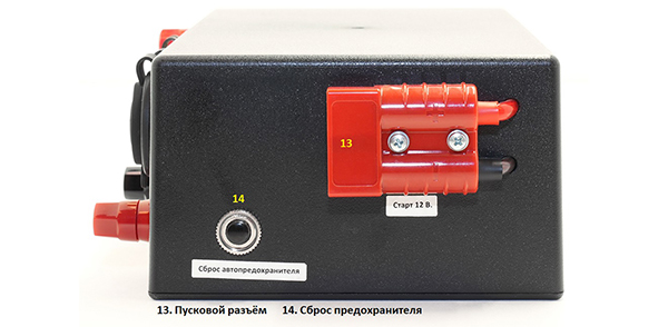 13 - Гнездо для аварийного запуска (старта) всевозможной техники с бортовым напряжением 12 В., таких как генераторы, автомобили и прочее с током потребления – 380 А. – 1 - 3 сек., 180 А. – 3 - 10 сек. 100 А. – 60 сек. В комплект поставки входит шнур для запуска автомобиля и техники.