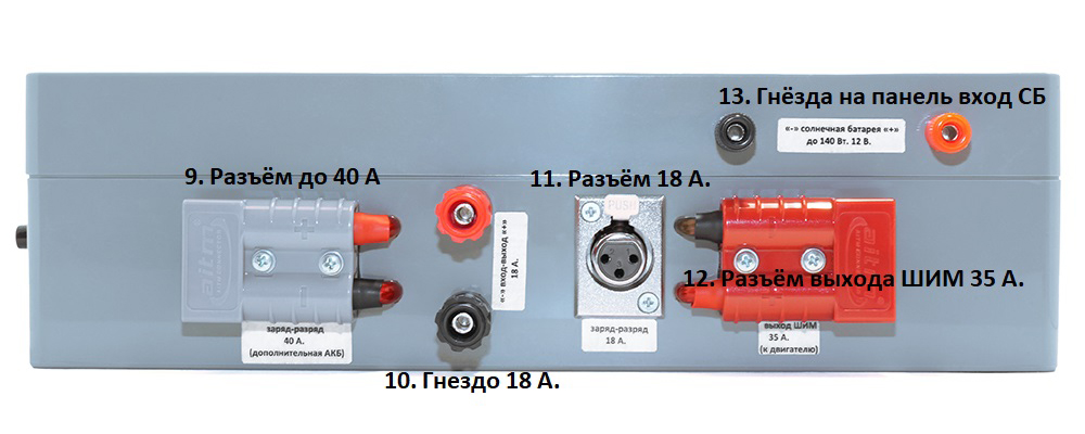 12. Разъём выхода ШИМ для подключения лодочных моторов с током потребления до 40 А.