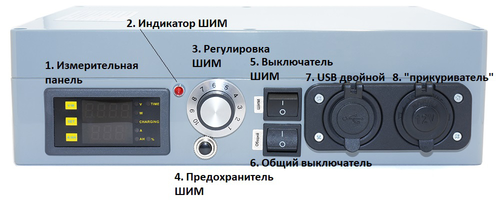 1. Измерительная панель с индикацией тока, напряжения, мощности, времени работы, количества оставшихся ампер – часов и оставшегося % заряда АКБ.